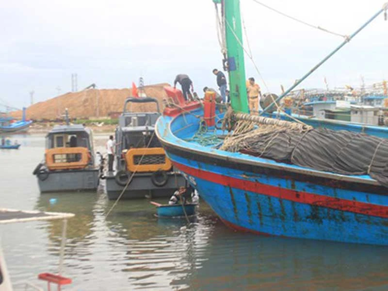 Các lực lượng chức năng đang cứu hộ một tàu cá ở vịnh Quy Nhơn. Ảnh: HT