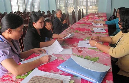 Đoàn kiểm tra đang làm việc với bà Ánh (hàng bên trái, trong cùng). Ảnh: HỒNG MINH