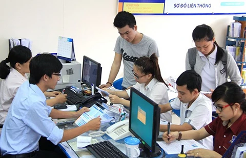 Đa số các trường ĐH đều lấy điểm xét tuyển từ 15 để tránh gặp khó về nguồn tuyển. Trong ảnh: Thí sinh tìm hiểu để chuẩn bị nộp hồ sơ vào Trường ĐH Nguyễn Tất Thành. Ảnh: NTT