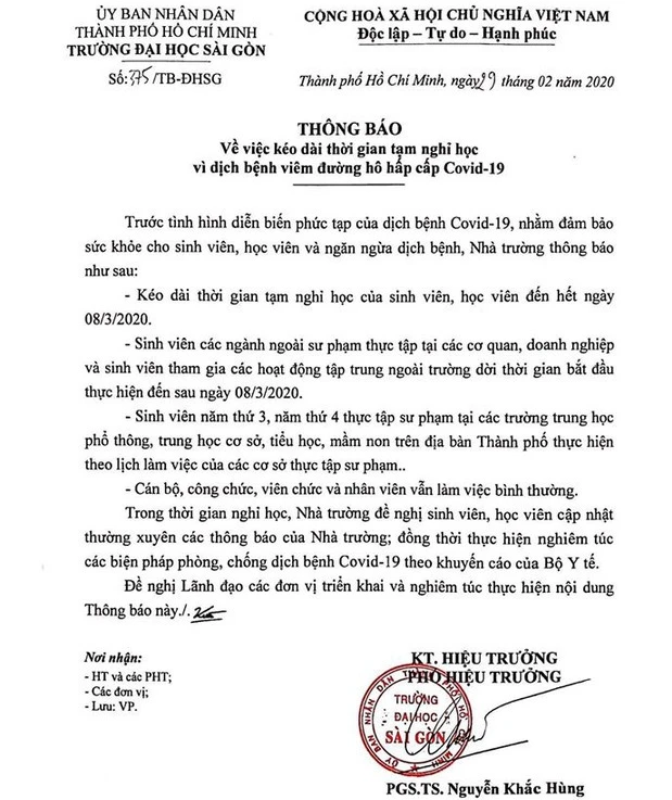 Tương tự, Trường ĐH GTVT TP.HCM và Trường ĐH Sài Gòn cũng quyết định tạm dừng việc đi học trở lại vào ngày 2-3 như thông báo trước đó và tiếp tục cho sinh viên nghỉ học đến hết ngày 8-3.