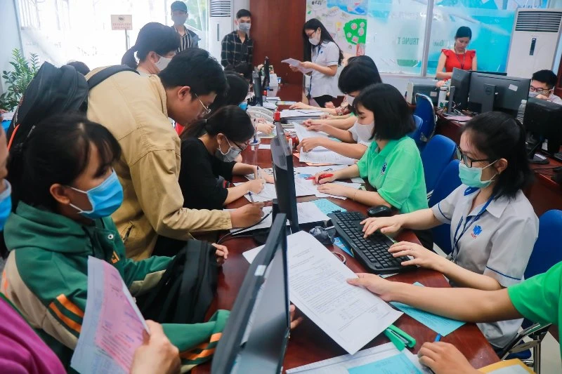 Phụ huynh, thí sinh nộp học bạ xét tuyển vào trường ĐH Công nghiệp thực phẩm TP.HCM. Ảnh: NT