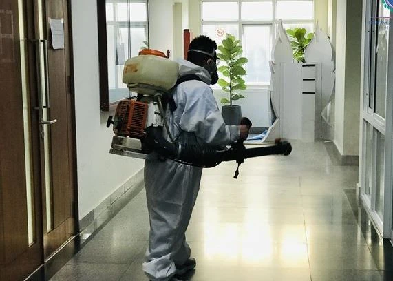Trường ĐH Luật TP.HCM tiếp tục phun khử khuẩn trong khuôn viên trường (ảnh: WEB TRƯỜNG)