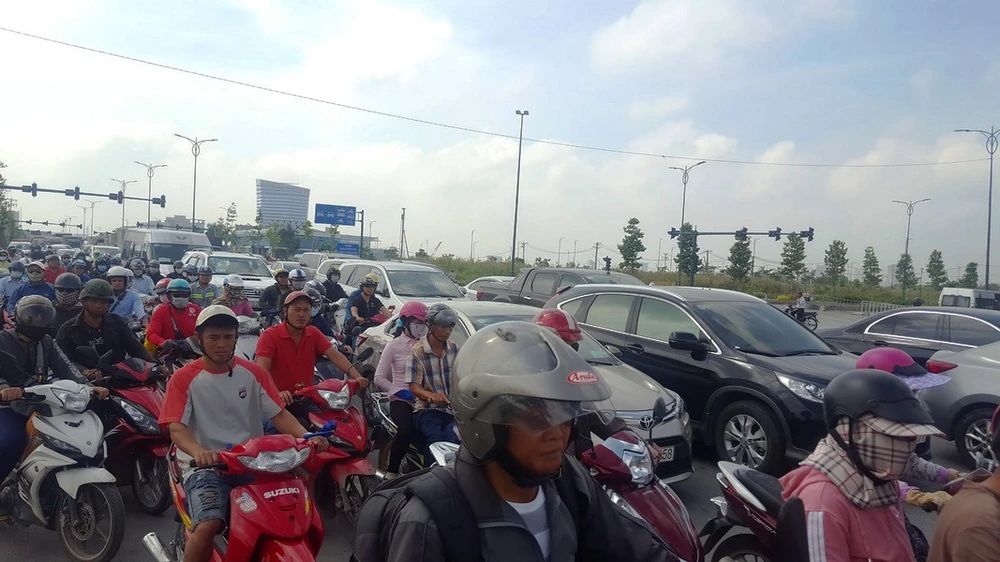 Đường Mai Chí Thọ rẽ lên cầu Thủ Thiêm bị kẹt cứng. Ảnh: ĐÀO TRANG