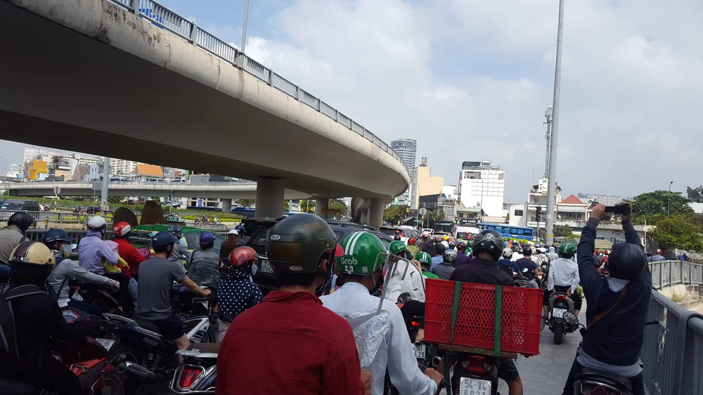 Đoạn đường kết nối giữa cầu Thủ Thiêm và Nguyễn Hữu Cảnh bị kẹt cứng. Ảnh: ĐÀO TRANG