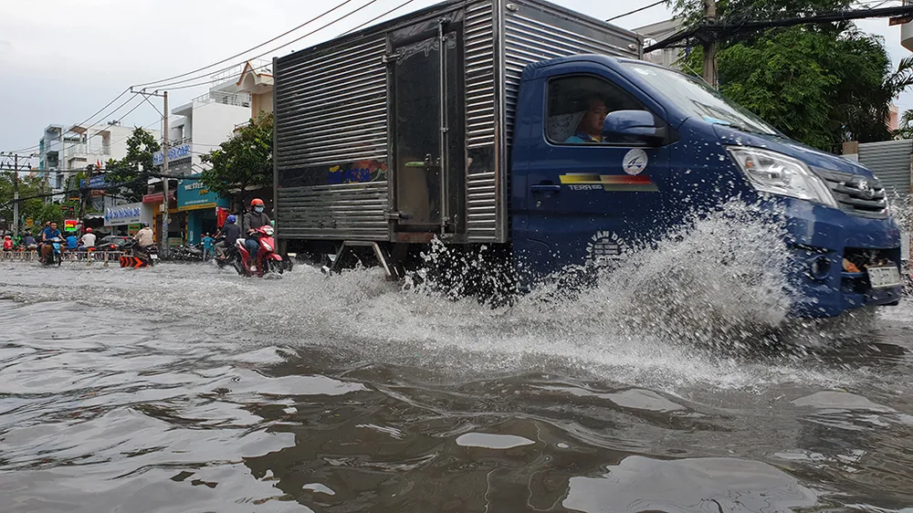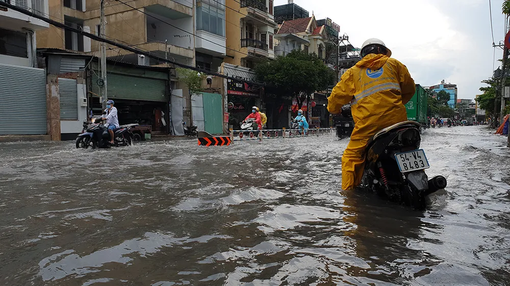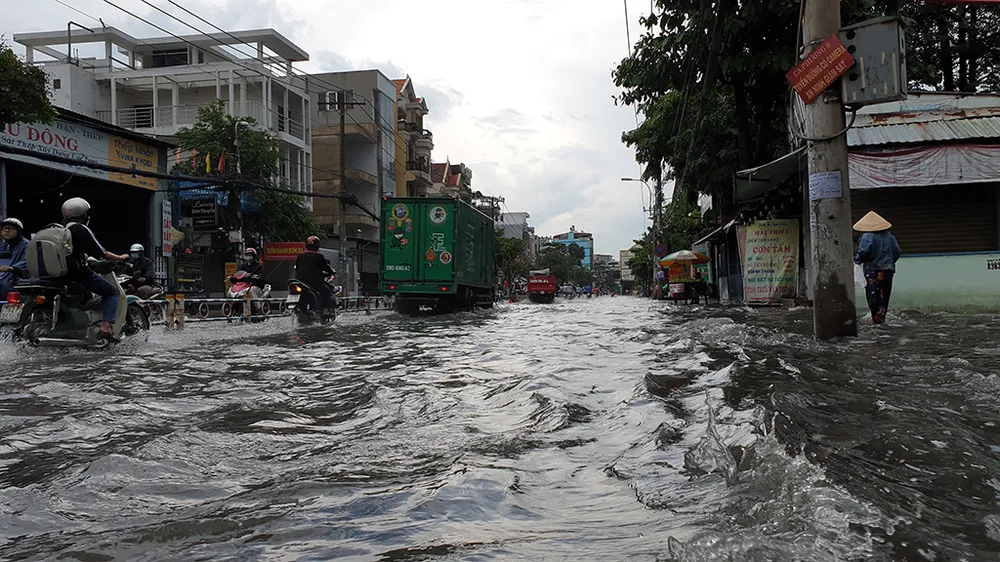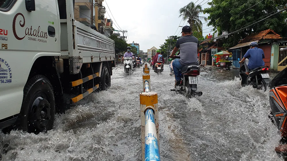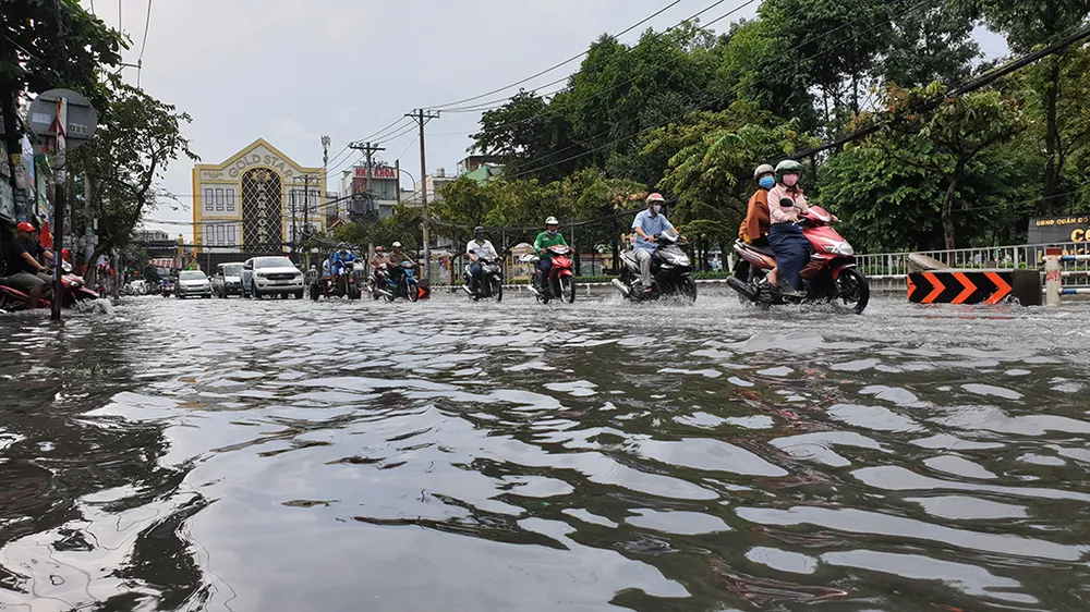 Trên đường Cây Trâm (quận Gò Vấp) đoạn ngập cục bộ kéo dài khiến các phương tiện lưu thông gặp không ít khó khăn. Ảnh NT