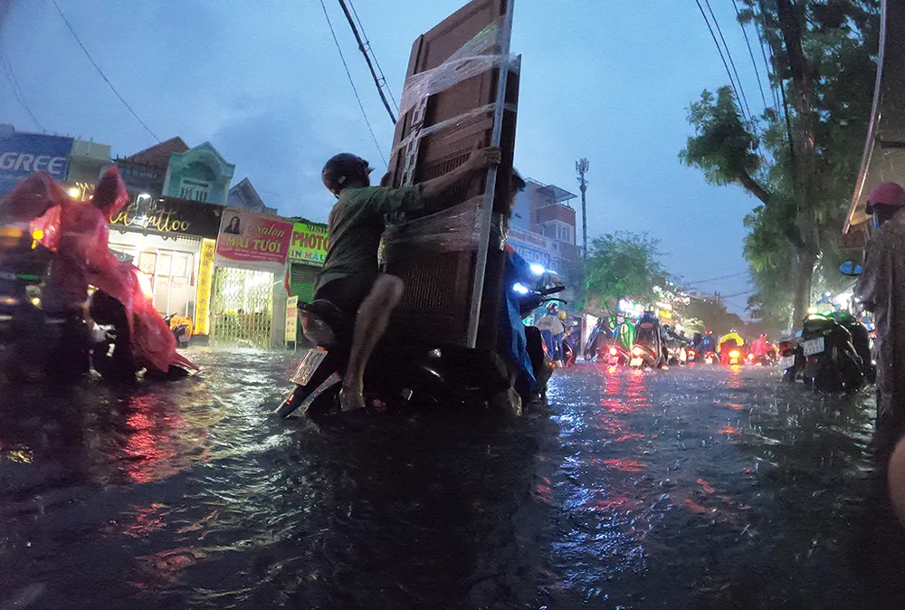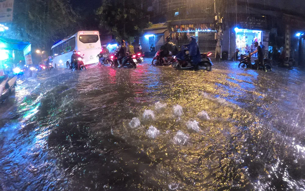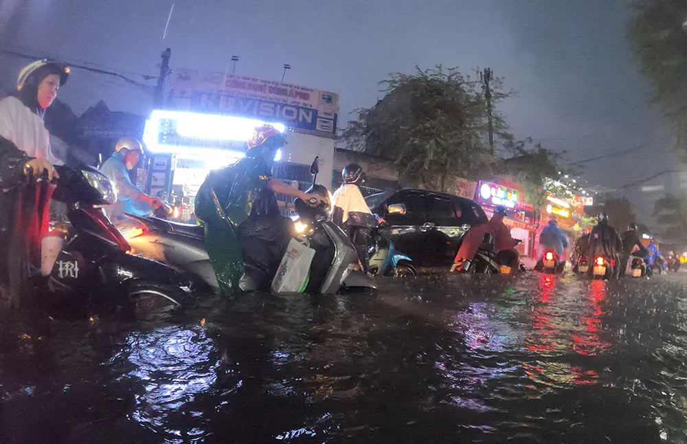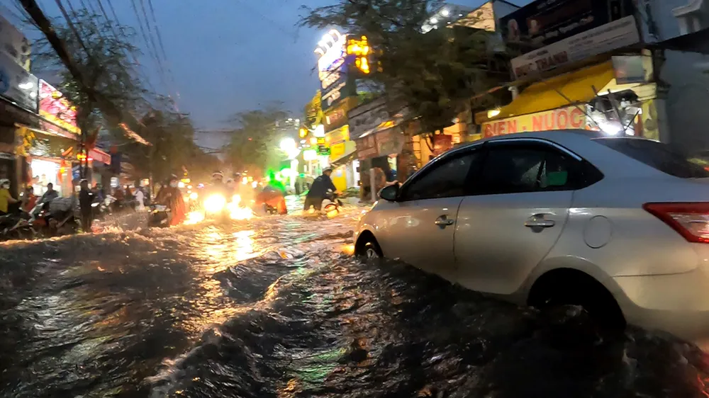 Đường ngập, mưa lớn đúng vào giờ tan tầm khiến các phương tiện lưu thông gặp không ít khó khăn. Ảnh: NGUYỄN TÂN.