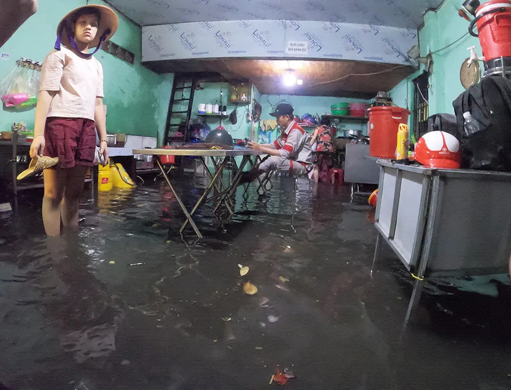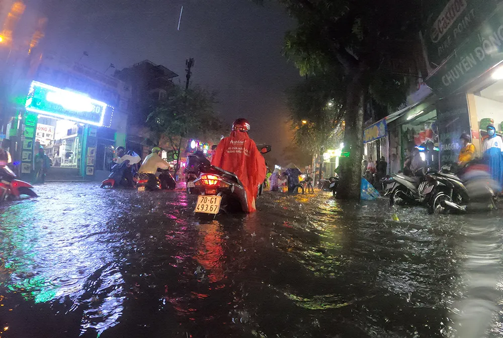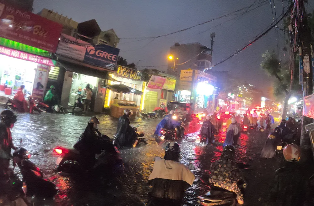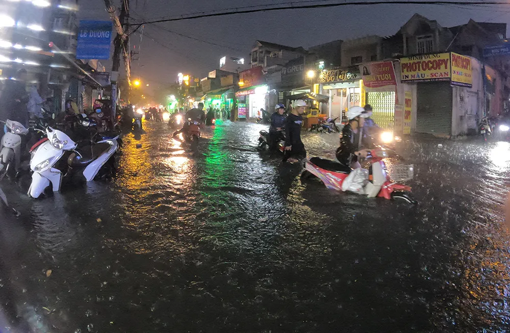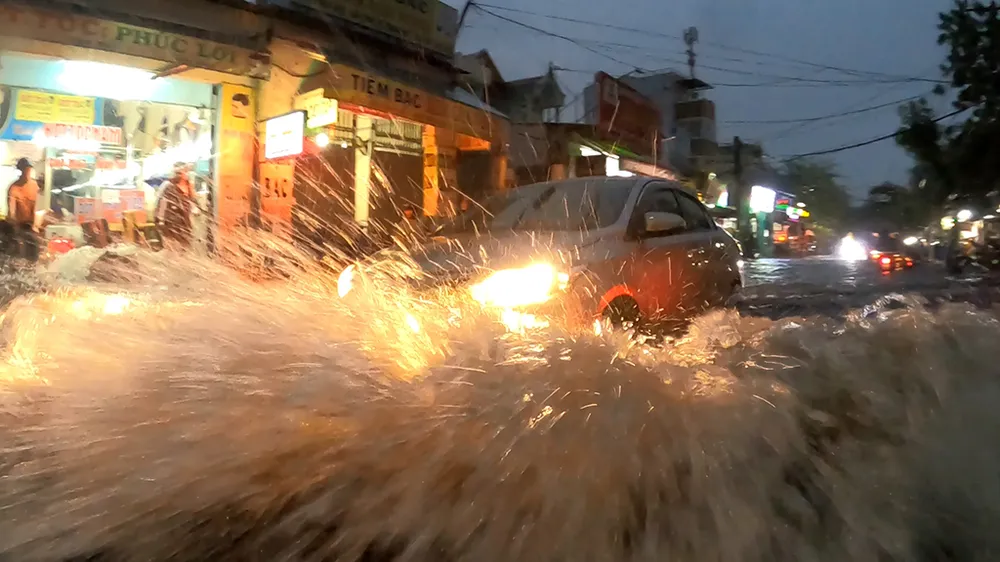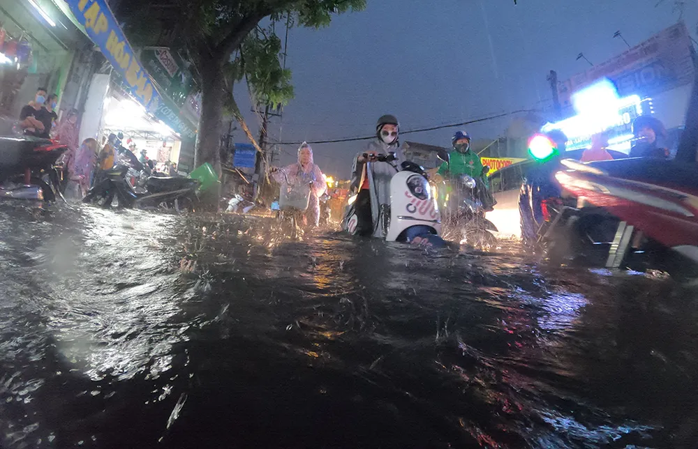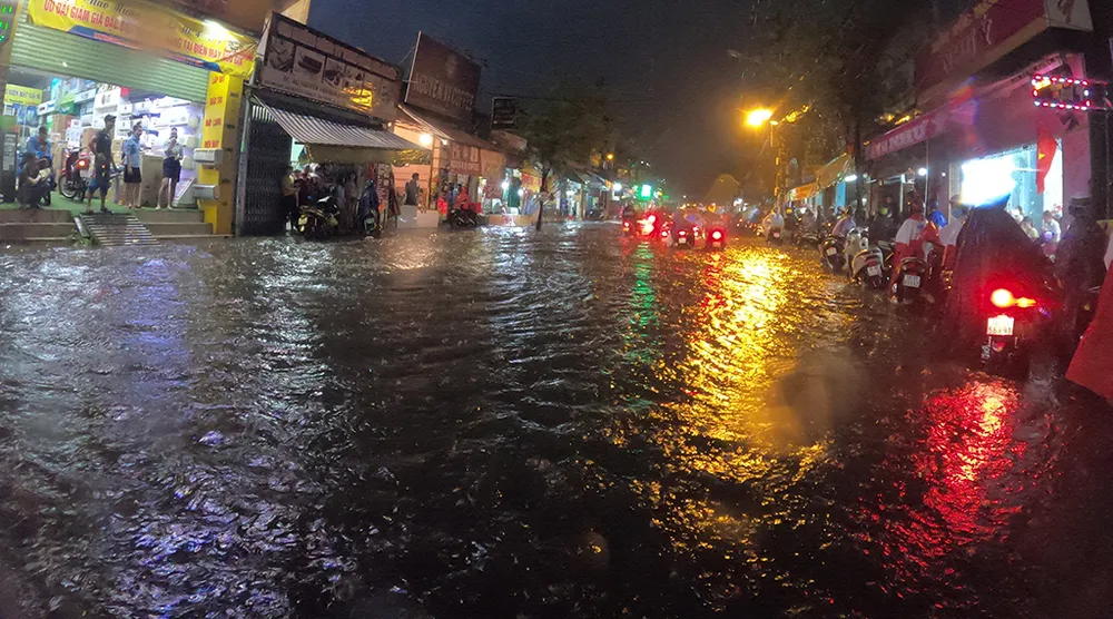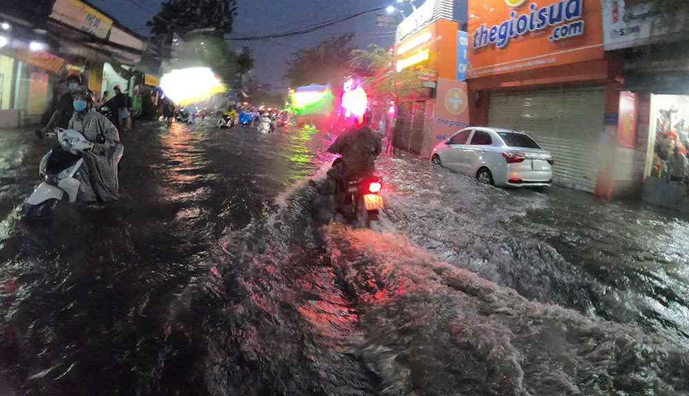 Đường Nguyễn Văn Quá (quận 12) biến thành biển nước do lượng mưa đổ xuống quá lớn, hệ thống cống mặc dù được đầu tư nâng cấp nhưng không thể tiêu thoát được kịp thời. Ảnh: NGUYỄN TÂN.