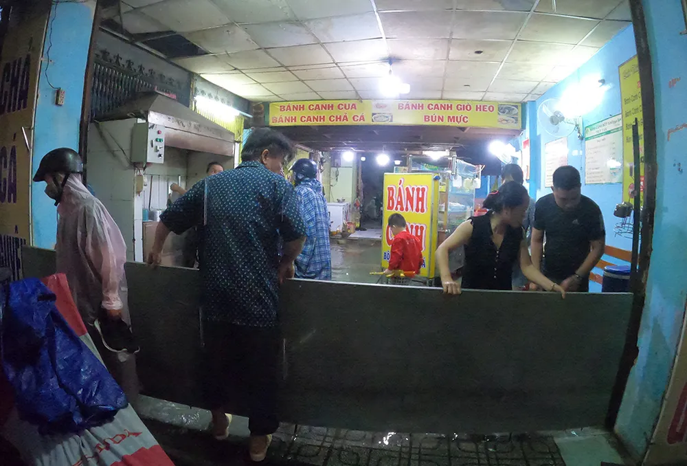 Do nước tràn vào nhà, nhiều người dân ven các tuyến đường ngập phải dùng các vật dụng chắn cửa để giảm các sóng nước ùa vào làm ướt đồ đạc. Ảnh: NGUYỄN TÂN.