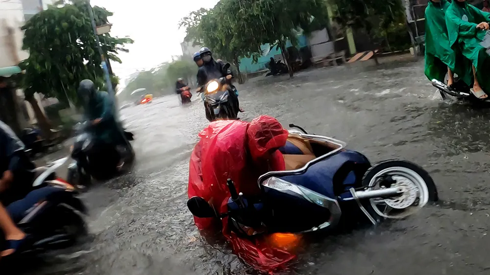Một người phụ nữ mang bầu bị té xe trên đường Song Hành (phường Tân Thuận, quận 12) do đường ngập, mưa lớn. Ảnh: NGUYỄN TÂN.
