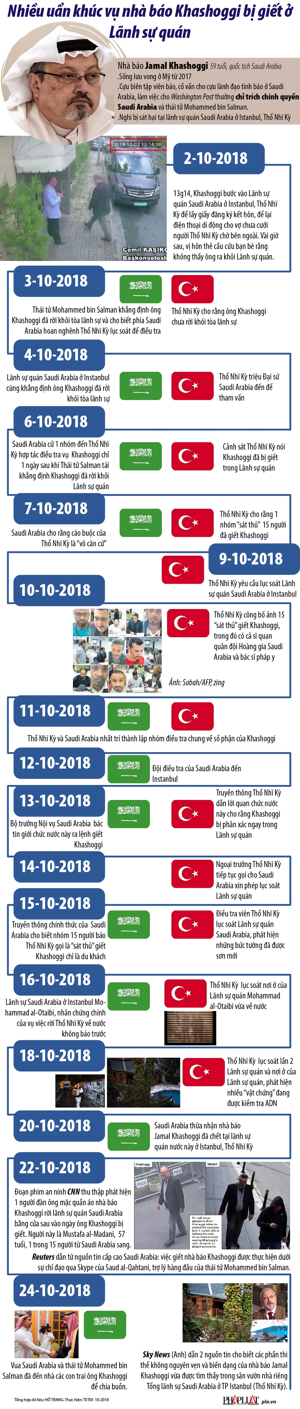 (PLO)- Nhà báo Khashoggi mất tích sau khi vào lãnh sự quán Saudi Arabia ở Istanbul (Thổ Nhĩ Kỳ) và đến nay được xác định đã bị giết trong một cuộc ẩu đả tại đây.