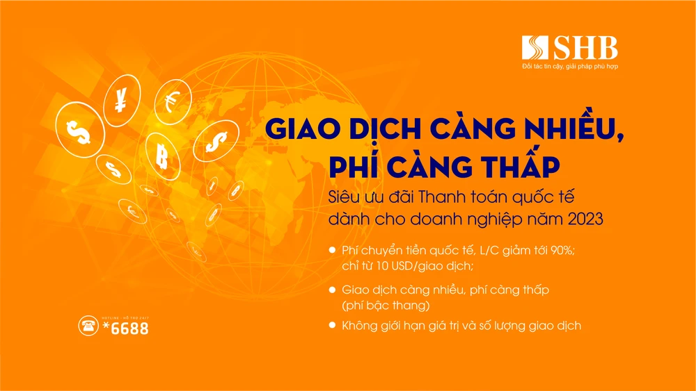 Nắm bắt nhu cầu của khách hàng, SHB triển khai Gói “siêu ưu đãi” thanh toán quốc tế nhằm mang lại các giải pháp tài chính hiệu quả dành cho khách hàng doanh nghiệp xuyên suốt năm 2023. Theo đó, gói gồm các chương trình ưu đãi phí thanh toán quốc tế như: chuyển tiền đi/đến, thư tín dụng (L/C)... đáp ứng nhu cầu thanh toán của các khách hàng doanh nghiệp xuất nhập khẩu.