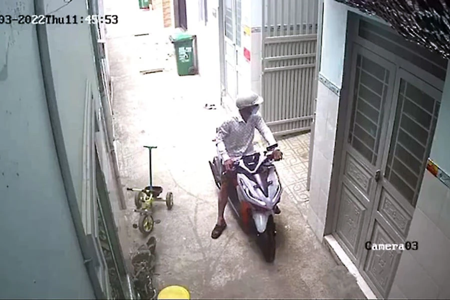 Theo hình ảnh từ camera an ninh, khoảng 11 giờ 45 trưa 10-3, một người đàn ông ngoài 30 tuổi đi xe tay ga hiệu Vario tới dãy trọ trên đường số 26, phường Phước Long A, TP Thủ Đức.
