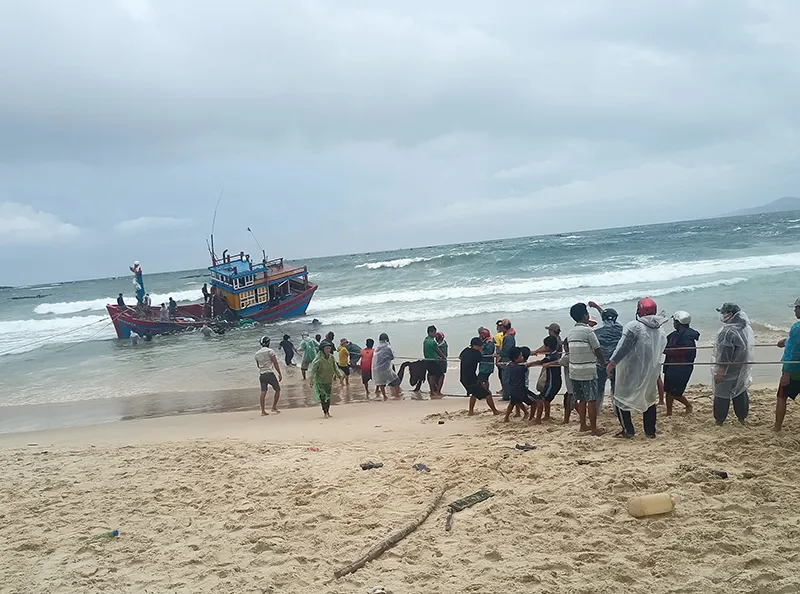 Người dân xã An Phú, TP Tuy Hòa, Phú Yên trục vớt, kéo tàu thuyền bị chìm vào bờ. Ảnh: CTV
