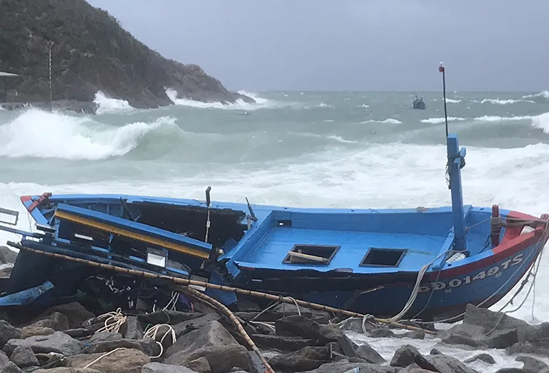 Một chiếc thuyền bị sóng đánh vào bờ đá hư hỏng nặng ở TP Quy Nhơn, Bình Định. Ảnh: BẠCH DƯƠNG