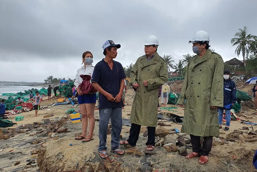 Ông Trần Hữu Thế, Chủ tịch UBND tỉnh Phú Yên (thứ hai từ phải sang) kiểm tra tình hình thiệt hại do thiên tai tại xã An Hòa Hải, huyện Tuy An. Ảnh: MINH KHÔI