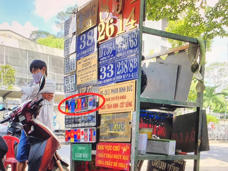 Trong vai một người cần làm mới biển số xe, PV được chủ một cửa hàng trên đường Thuận Kiều (quận 5) tư vấn gắn một số mẫu để làm điểm nhấn như bản đồ VN, cờ VN và nhiều nước trên thế giới.