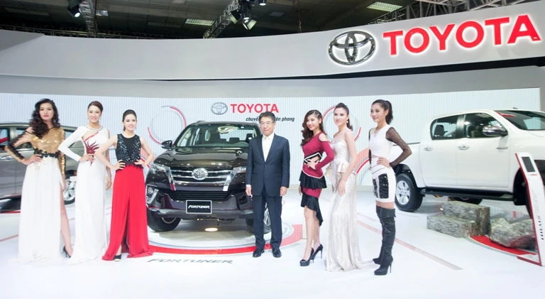 Gian hàng Toyota năm nay gây chú ý nhờ hai mẫu xe mới là Fortuner 2017 và Hilux 2017. Fortuner 2017 thiết kế hoàn toàn mới, vô cùng sắc sảo và năng động, được trang bị khung gầm chắc chắn, ngoại thất hiện đại hơn và nội thất xe cao cấp hơn nhờ những chi tiết ốp gỗ hoặc bọc da sang trọng.