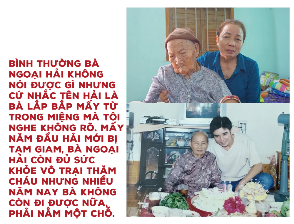 Bình thường bà ngoại Hải không nói được gì nhưng cứ nhắc tên Hải là bà lắp bắp mấy từ trong miệng mà tôi nghe không rõ. Mấy năm đầu Hải mới bị tạm giam, bà ngoại Hải còn đủ sức khỏe vô trại thăm cháu nhưng nhiều năm nay bà không còn đi được nữa, phải nằm một chỗ.