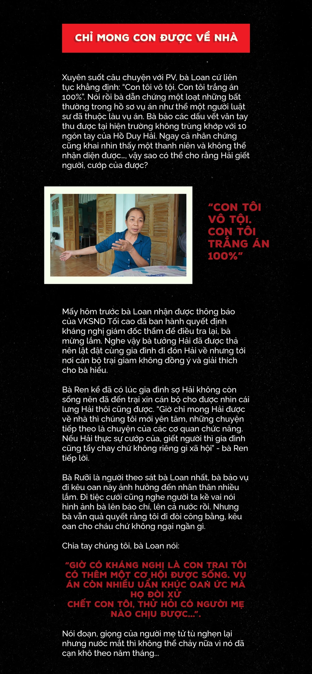 Bà bảo suốt 12 năm trời cứ trông đến ngày thăm nuôi, bà đến trại giam cách nhà chừng 20 km thăm Hải. Thời gian còn lại bà đi cậy nhờ, cầu cứu khắp nơi kêu oan cho con. Bà phải gom góp tiền bạc để cố gắng lặn lội ra Hà Nội, gõ cửa từng cơ quan với niềm hy vọng phải giữ được mạng sống của con. Khi chúng tôi đến nhà cũng là thời điểm bà mới đi Hà Nội về được mấy bữa ngay trước khi có kháng nghị giám đốc thẩm của VKSND Tối cao.