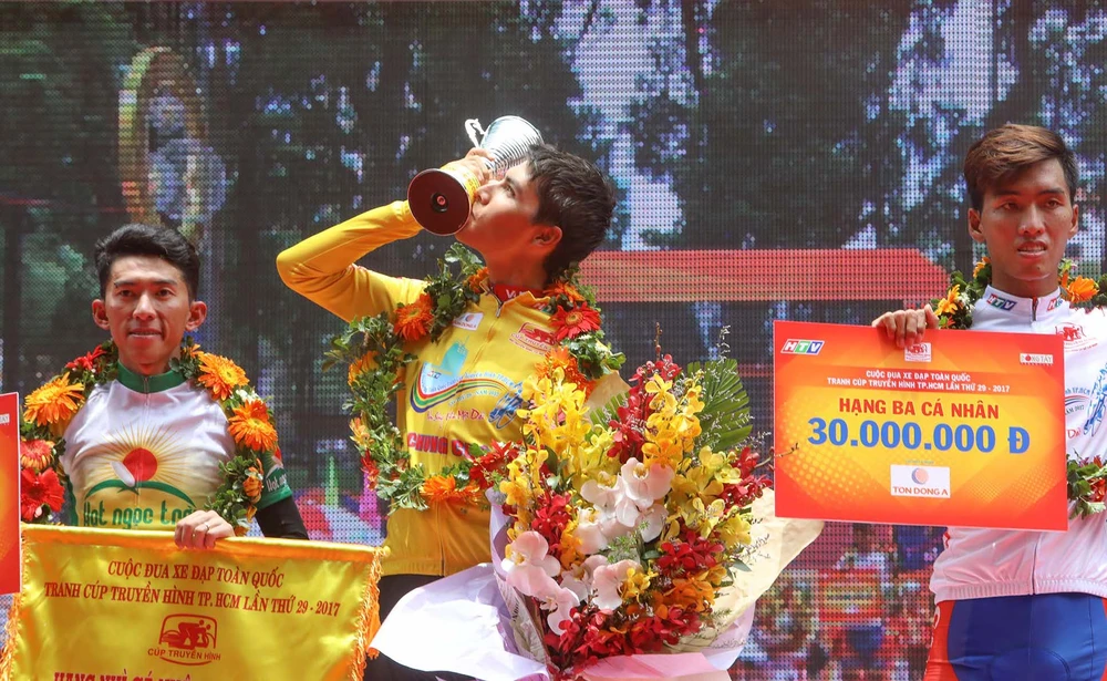 Alex Ariya Phounasavtah (giữa) nâng cao chiếc cúp vô địch cá nhân. Bên trái là á quân Lê Ngọc Sơn, bên phải là Nguyễn Nhật Nam giành giải áo Trắng - tay đua trẻ xuất sắc nhất. Với chiếc áo vàng chung cuộc của Alex, HLV Đỗ Thành Đạt một lần nữa chứng minh các học trò dù mới hay cũ mới đều được ông trao cơ hội đăng quang. ẢNH: PHẠM HUY
