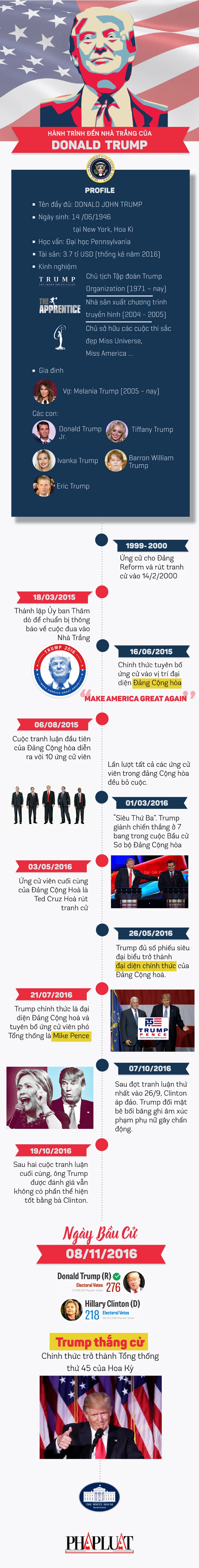 (PLO)- Ông Donald J.Trump cuối cùng đã giành được thắng lợi sau một mùa tranh cử dài nhiều biến động. Cùng báo Pháp Luật TP.HCM nhìn lại con đường vị tỉ phú 69 tuổi từ New York trở thành tổng thống thứ 45 của nước Mỹ.