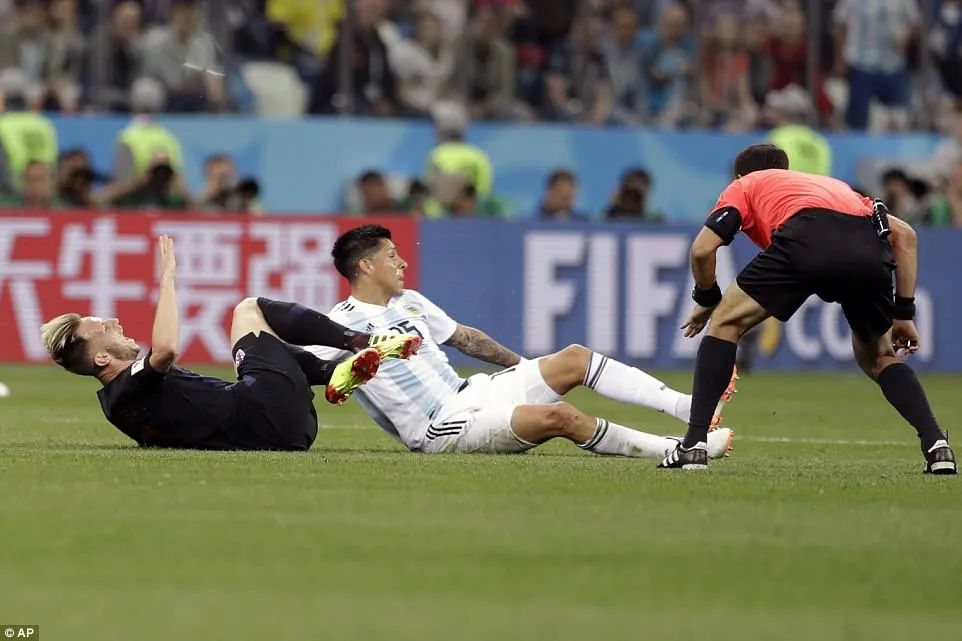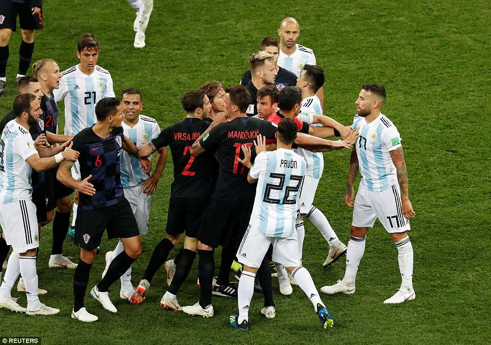 Cầu thủ Argentina tranh cãi với trọng tài sau một pha phạm lỗi. Những phút đầu trận Mandzukic là đích nhắm trong những pha phạm lỗi thô bạo của Argentina. Mandzukic hiện là tiền đạo cắm duy nhất của Croatia tại World Cup sau khi Nikola Kalinic bị HLV Zlatko Dalic đuổi về nước vì tội vô kỷ luật, từ chối vào sân thay người ở những phút cuối trận Croatia thắng Nigeria 2-0.