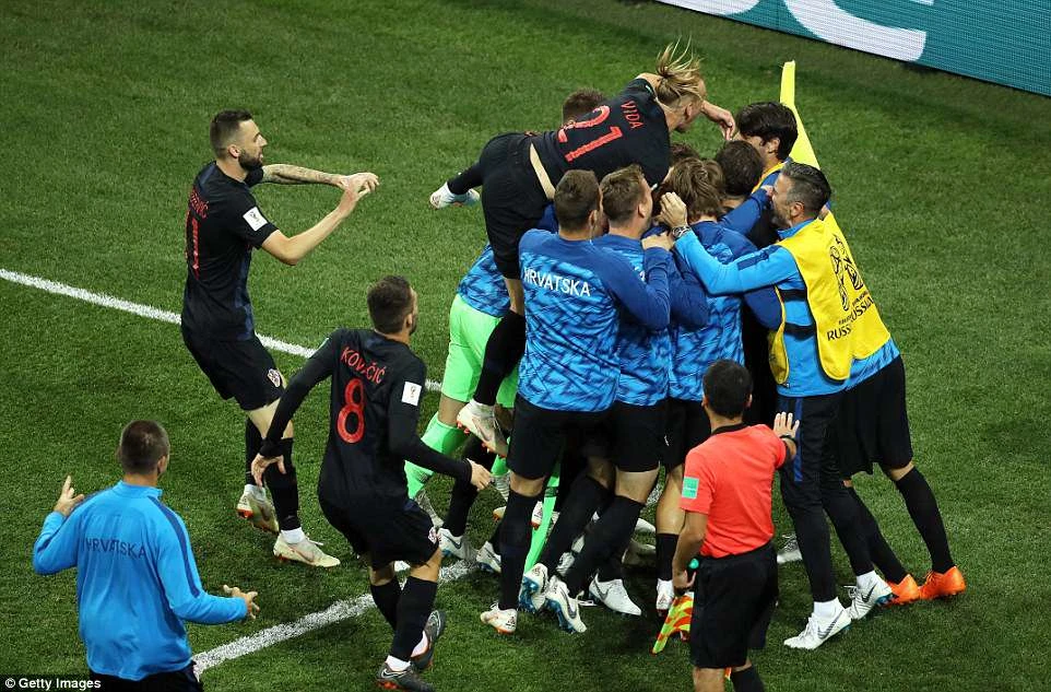 Cầu thủ Croatia vây quanh Modric ăn mừng đầy phấn khích.