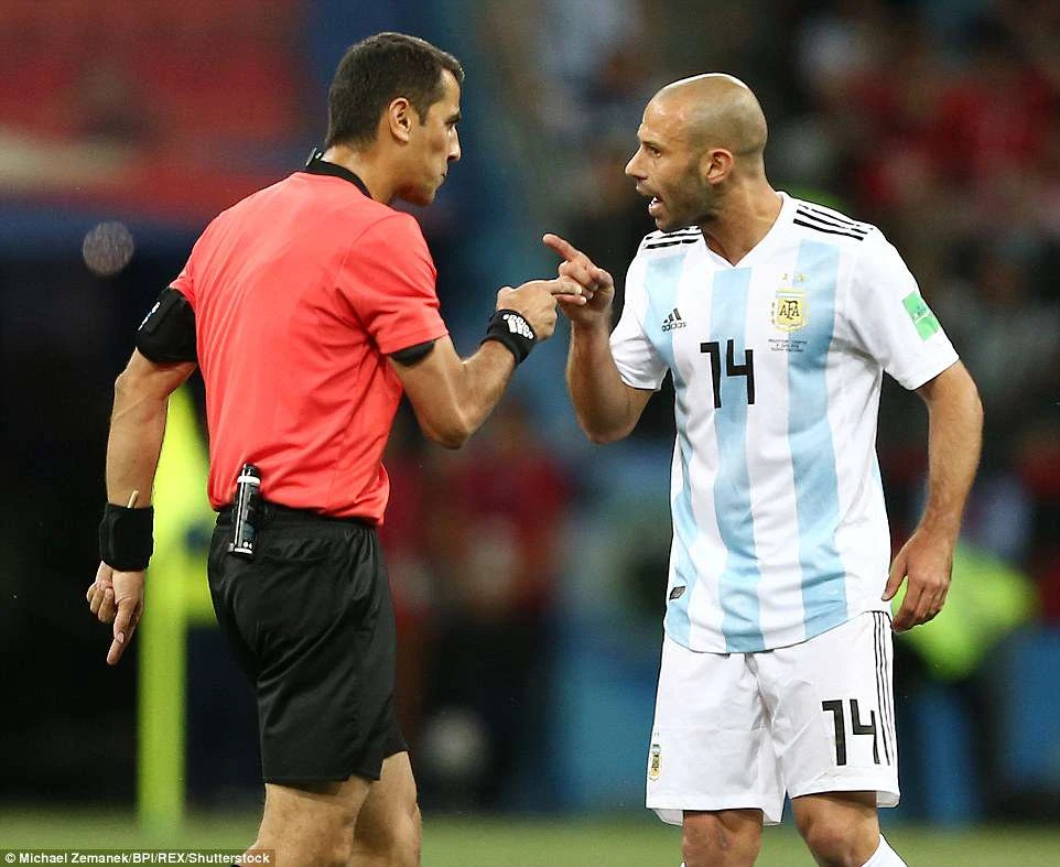 Javier Mascherano tranh cãi với trọng tài Ravshan Irmatov sau khi anh phạm lỗi với Luka Modric.