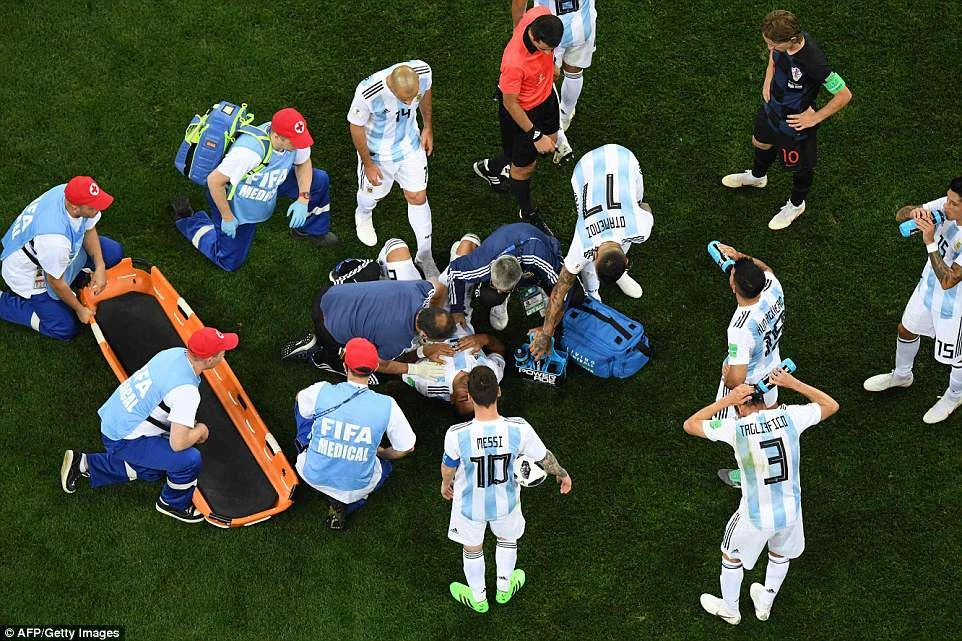 Hậu vệ Gabriel Mercado của Argentina phải nhờ đội ngũ y tế trợ giúp sau pha va chạm trong hiệp 1.