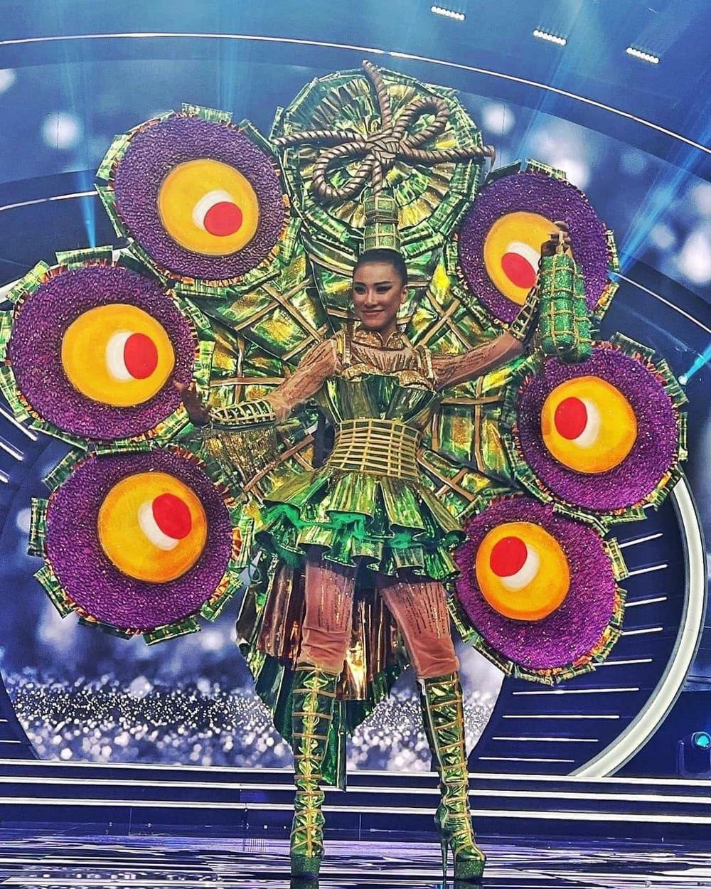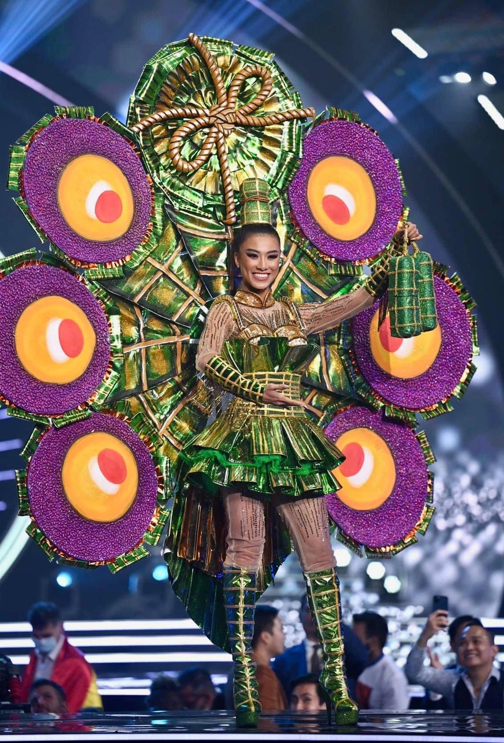 Phần thi trang phục dân tộc, Nguyễn Huỳnh Kim Duyên - thí sinh Việt Nam sải bước tự tin với nụ cười rạng rỡ trong trang phục “Ai tét hông” của NTK Khoa Lỗ. Đến chính giữa sân khấu, những khoanh bánh tét trên trang phục dân tộc của Kim Duyên được “kích hoạt” bung xòe, tạo hiệu ứng được khán giả vỗ tay cỗ vũ.