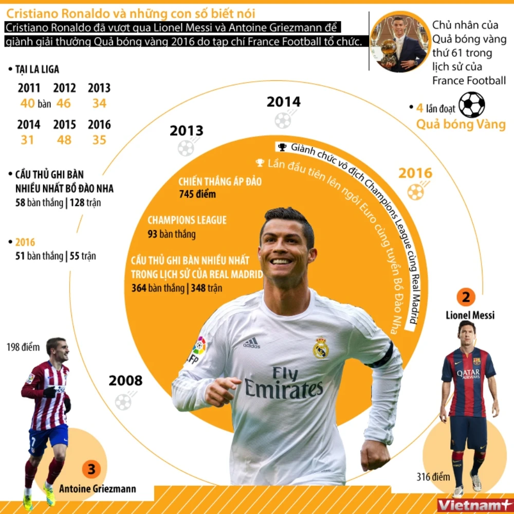 Với thành tích thi đấu vô cùng ấn tượng, tiền đạo Cristiano Ronaldo (Real Madrid) đã trở thành chủ nhân của danh hiệu Quả bóng vàng 2016 do tạp chí France Football bầu chọn./.