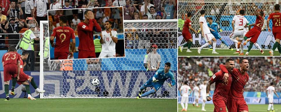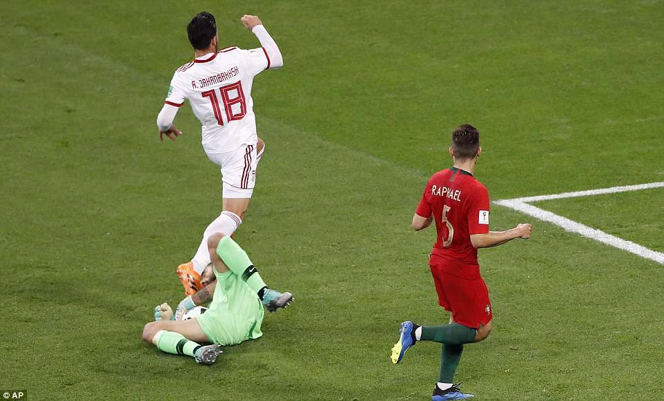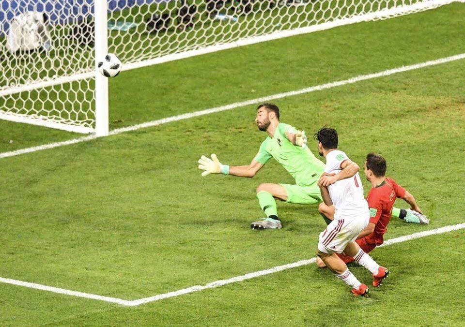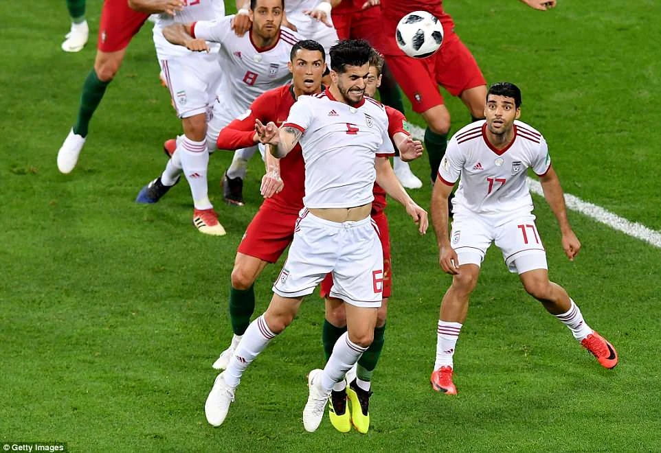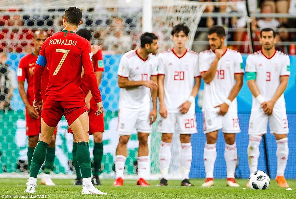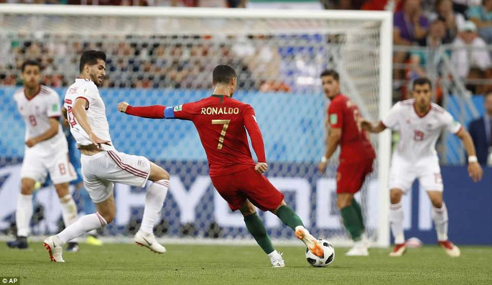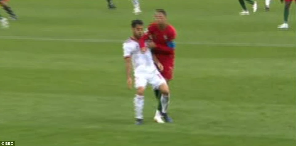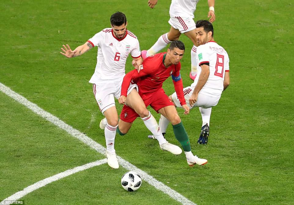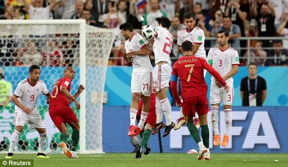 Quả đá phạt của Ronaldo chạm vào tay cánh tay đã khép lại của cầu thủ Iran. Ronaldo đòi trọng tài thổi phạt đền nhưng không thành công.