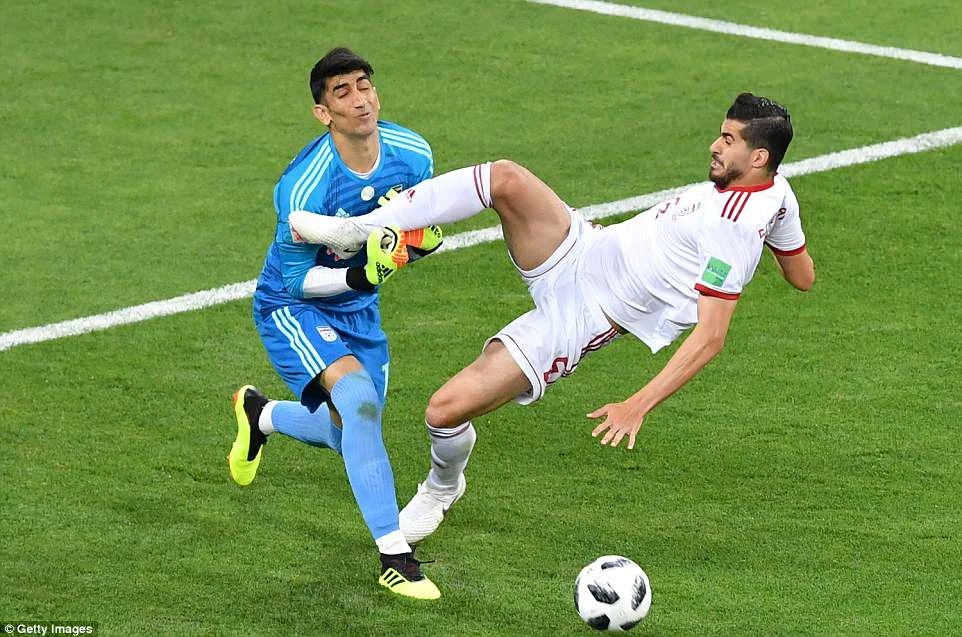 Thủ thành Ali Beiranvand của Iran đã có những phút đầu tiên thi đấu lúng túng, anh va chạm với đồng đội Saeid Ezatolahi trong lúc lao ra phá bóng.