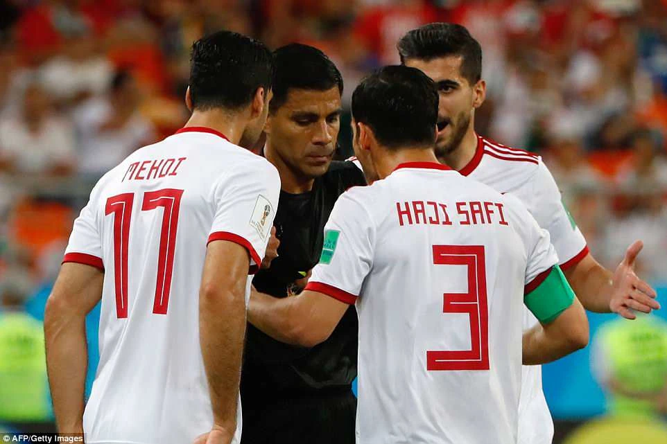 Trọng tài xem lại công nghệ VAR và chỉ tay vào chấm 11m trong sự phản đối của cầu thủ Iran.