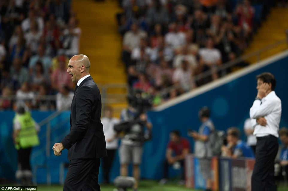 HLV Martinez hét lên chỉ đạo các học trò Bỉ ngoài đường biên trong khi HLV Nishino của Nhật Bản ở phía xa thì trầm ngâm.