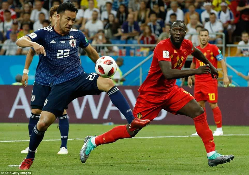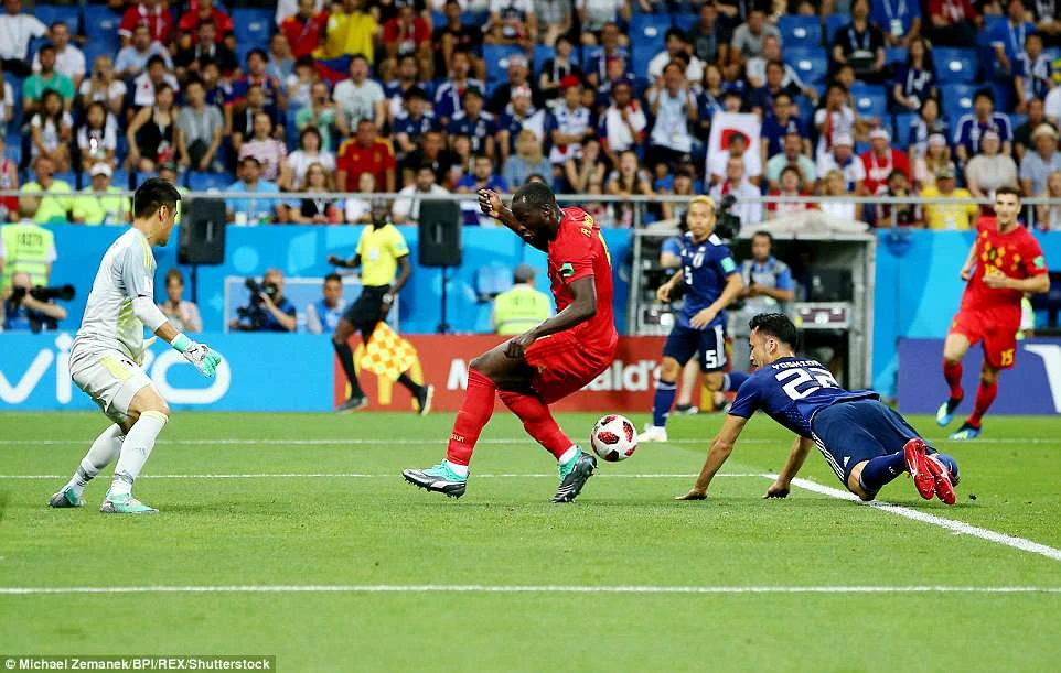 Trước sự đeo bám quyết liệt của hậu vệ Maya Yoshida, Lukaku sút hụt bóng trước khung thành rộng mở.