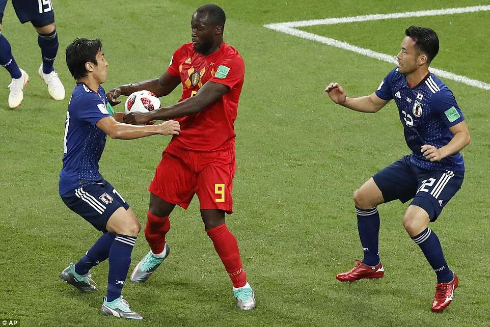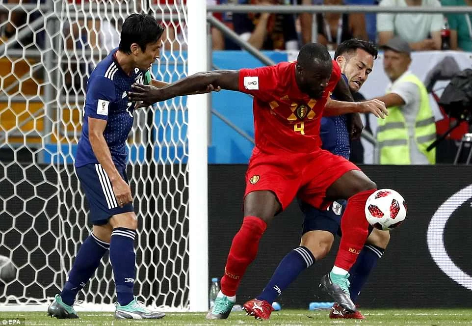 Tiền đạo Lukaku cựa quậy giữa hai cầu thủ Nhật Bản trong vòng cấm.