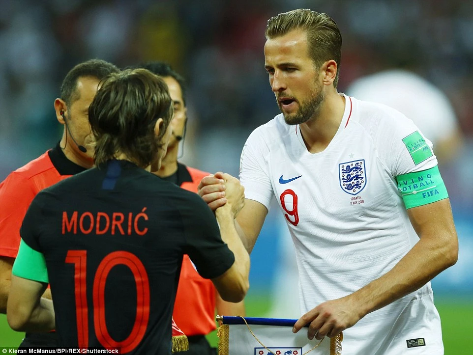 Hai đội trưởng Harry Kane của Anh và Luka Modric của Croatia bắt tay nhau trước trận đấu.