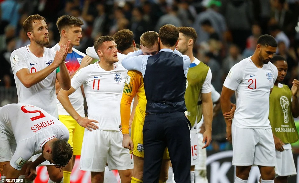 HLV Gareth Southgate ôm thủ thành Jordan Pickford an ủi.