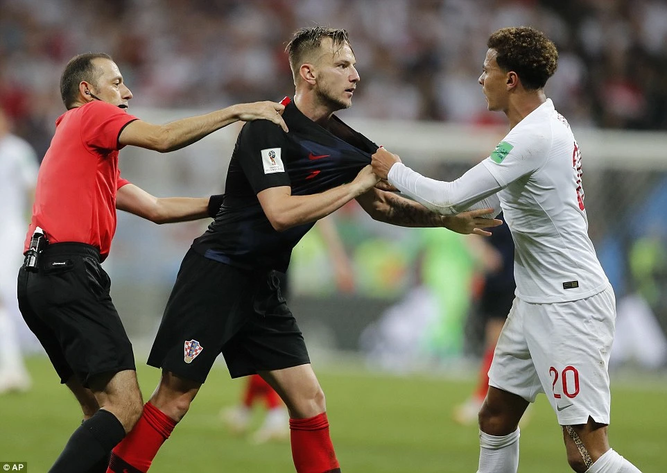 Các cầu thủ Anh không giữ nỗi bình tĩnh trong những phút cuối hiệp phụ thứ hai. Dede Alli nắm áo Rakitic muốn ăn thua đủ trong sự can ngăn của trọng tài.