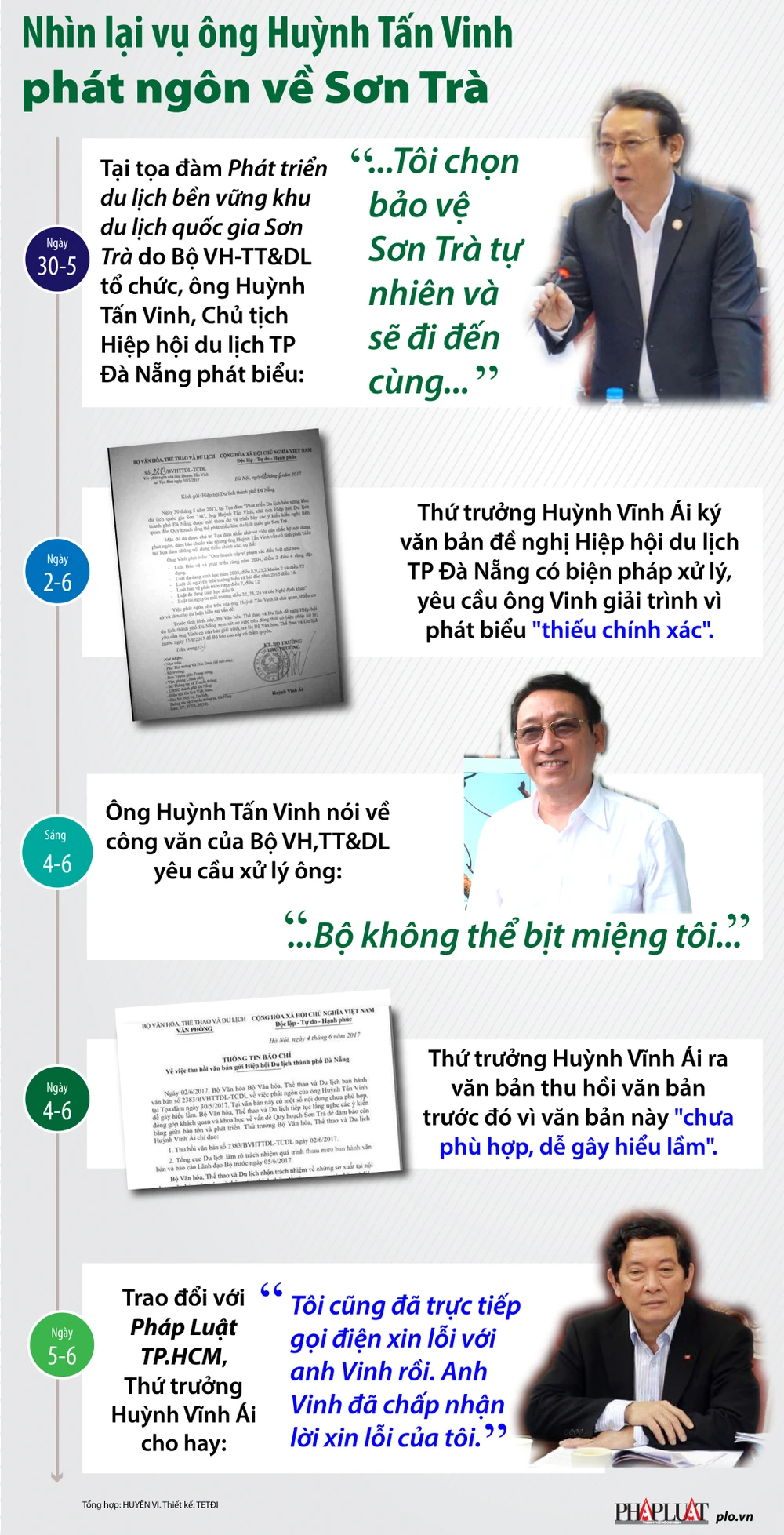 (PLO)- Sau khi ra văn bản đề nghị xử lý ông Huỳnh Tấn Vinh, Chủ tịch Hiệp hội Du lịch TP Đà Nẵng vì phát ngôn tại một buổi tọa đàm, ngày 4-6, Bộ VH-TT&DL đã có công văn thu hồi văn bản nói trên. Sáng 5-6, Thứ trưởng Bộ VH-TT&DL Huỳnh Vĩnh Ái đã trực tiếp gọi điện xin lỗi ông Huỳnh Tấn Vinh vì đã ra văn bản đề nghị xử lý ông Vinh.