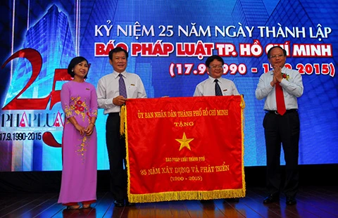 Ông Tất Thành Cang, Phó Chủ tịch UBND TP.HCM (bìa phải), trao cờ truyền thống cho báo Pháp Luật TP.HCM. Ảnh: HTD