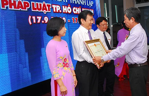 Phó Cục trưởng Cục Công tác phía Nam Bộ Tư pháp Hoàng Kim Chiến trao bằng khen của Bộ Tư pháp cho báo Pháp Luật TP.HCM. Ảnh: HTD