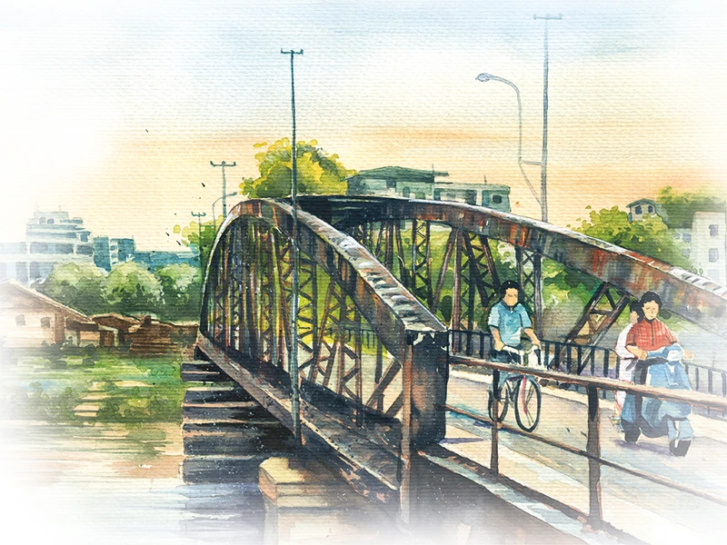 Một góc cầu sắt Đa Kao trước khi được xây dựng lại. Tranh màu nước của Phạm Công Tâm.