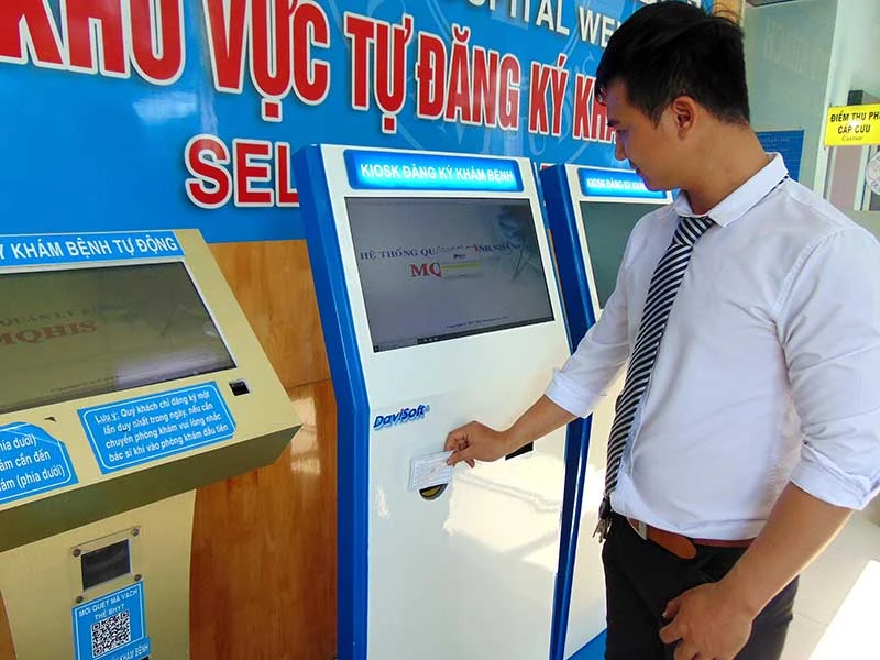 Bệnh nhân chỉ cần quẹt thẻ bảo hiểm y tế là biết được giờ và phòng khám. Ảnh: TRẦN NGỌC
