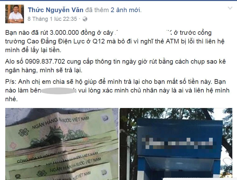 Ngày 8-1, anh Nguyễn Văn Thức đã đăng thông tin lên facebook cá nhân để nhờ cư dân mạng chia sẻ tìm chủ số tiền ba triệu đồng mà anh đã nhặt được ở cây ATM trước cổng trường Cao đẳng Điện lực, quận 12.