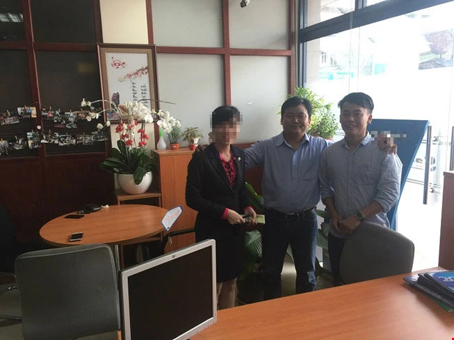 Vào lúc 10 giờ 15 phút ngày 10-1, chị Liễu (nhân viên ngân hàng nơi anh Sang rút tiền bị lỗi) đã đại diện anh Thức (giữa) trao lại số tiền cho anh Sang (đứng ngoài cùng)