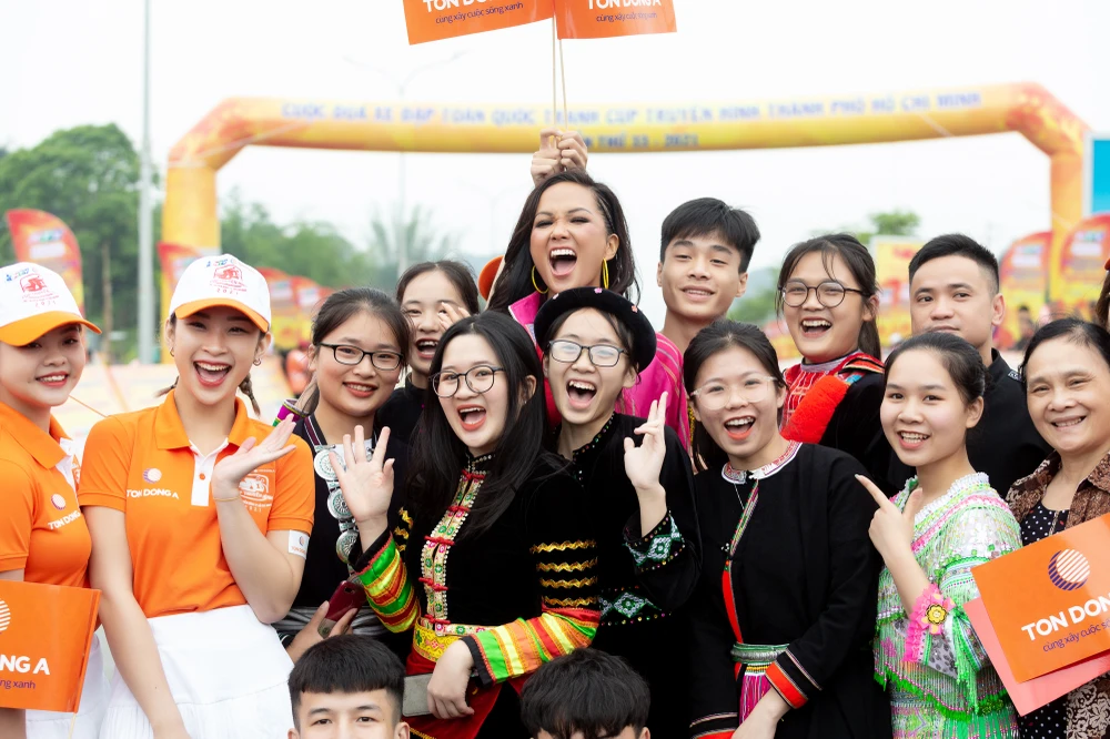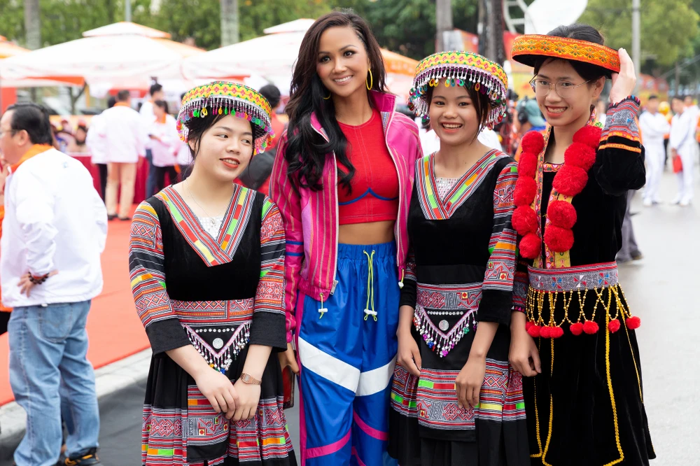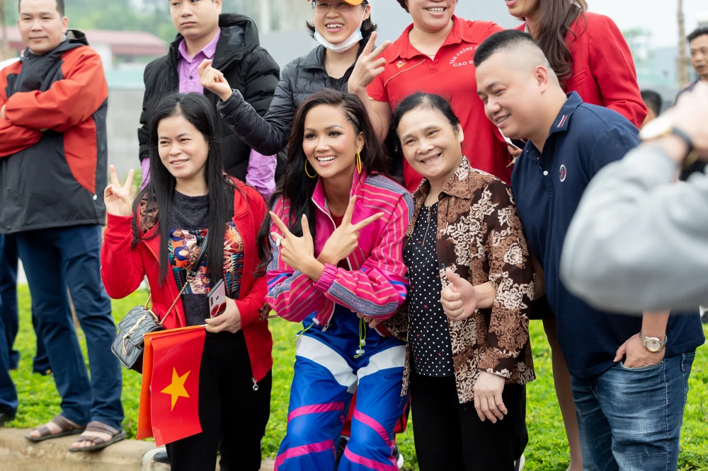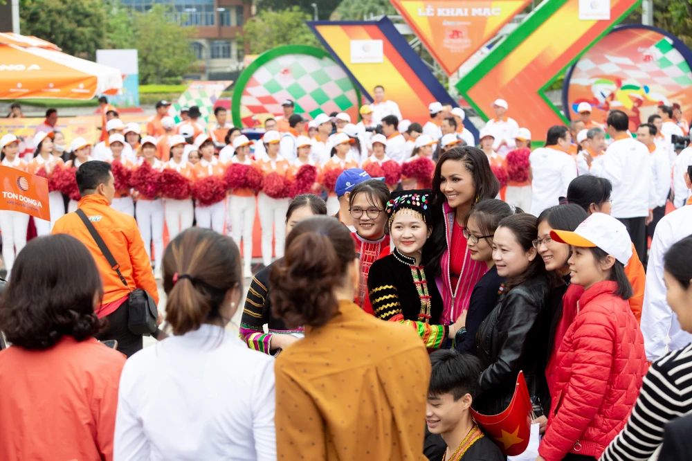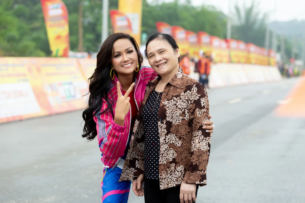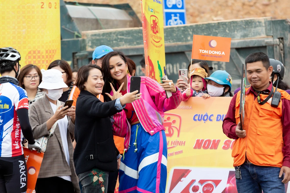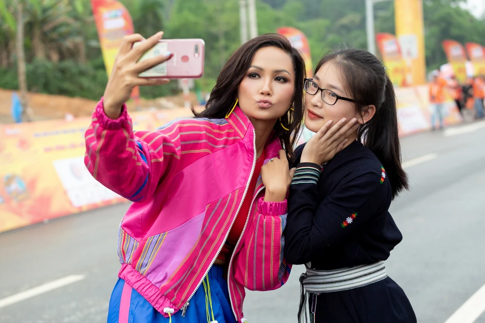 Trong buổi sáng diễn ra khởi động đường đua xe đạp, dù chưa bắt đầu nhưng nhiều khán giả nhất là các bà, các cô đã đến từ sớm để chờ gặp hoa hậu H’Hen Niê và xin chụp ảnh cùng. Cô hạnh phúc, vui vẻ chụp ảnh cùng mọi người và hào hứng nhún nhảy để cổ vũ tinh thần các tay đua.