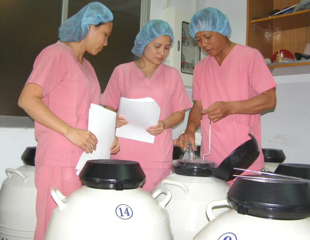 Bác sĩ BV Từ Dũ TP.HCM đang kiểm tra phôi trữ lạnh. Ảnh: TRẦN NGỌC