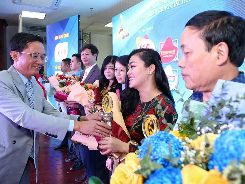 Ông Nguyễn Đức Hiển, Phó Tổng biên tập báo Pháp Luật TP.HCM, Trưởng ban tổ chức giải Fair Play 2020, trao cúp lưu niệm cho